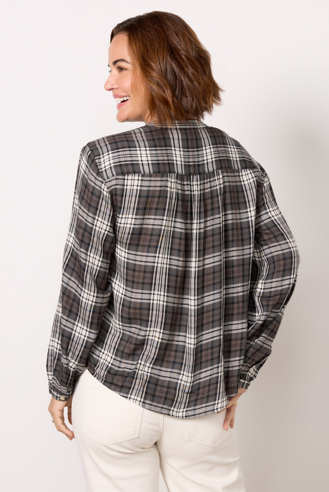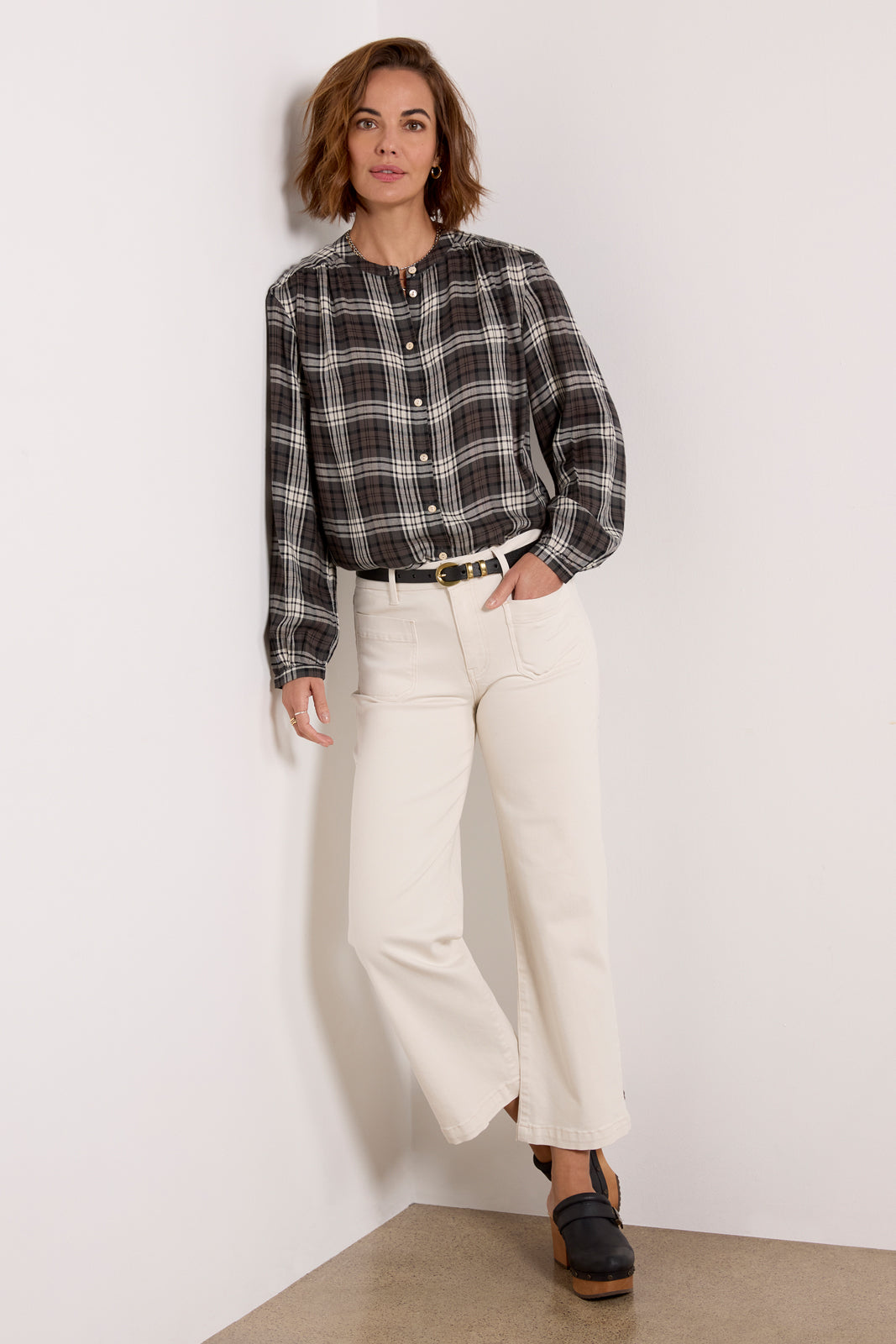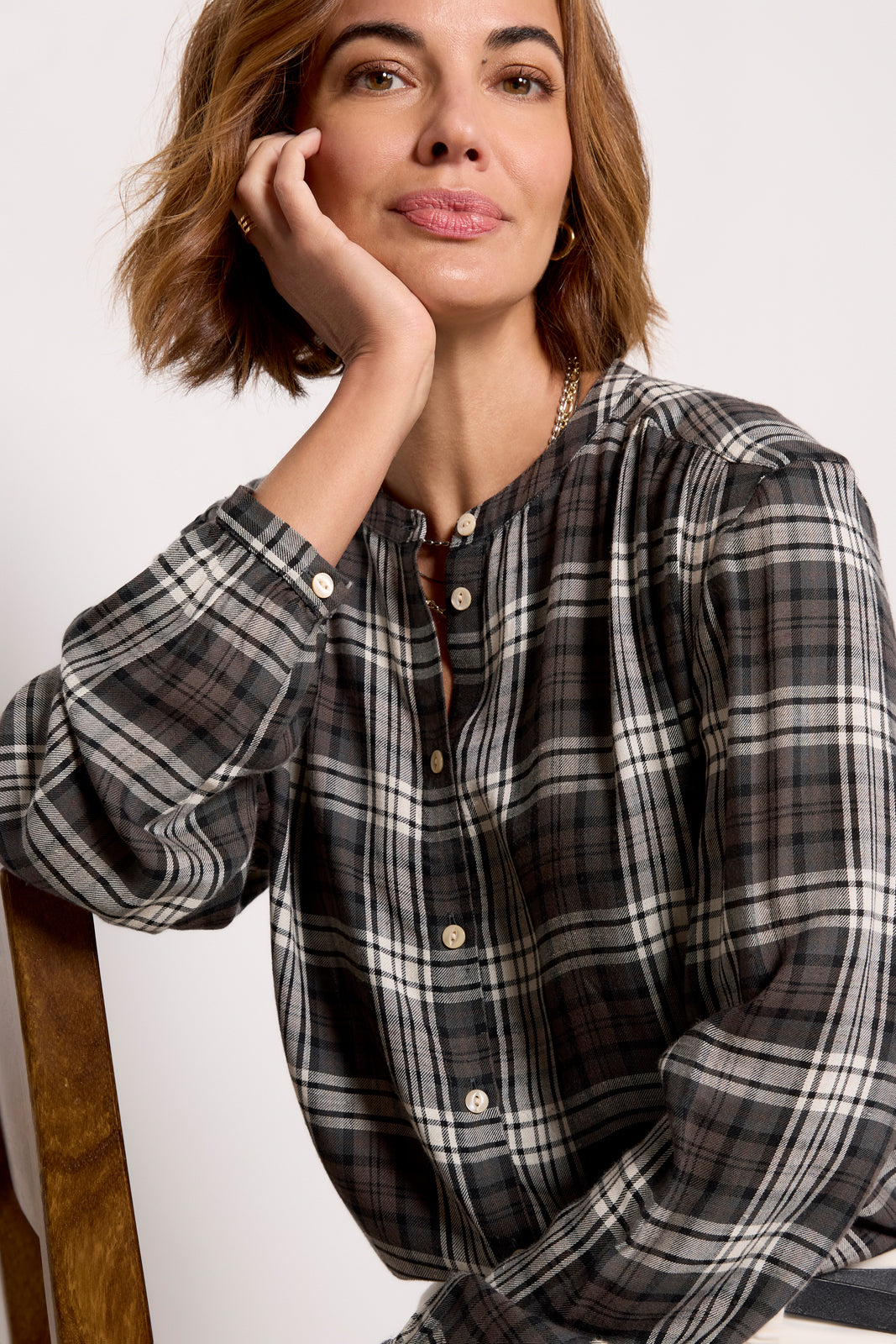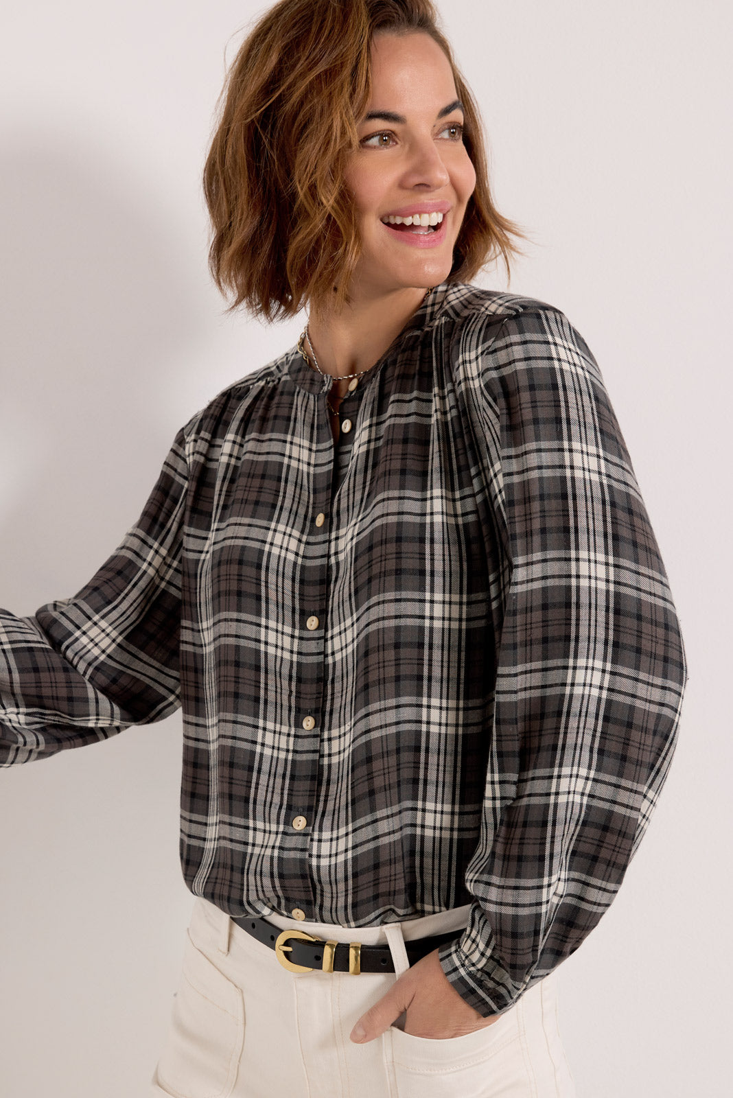 Step into fall with the perfect blouse from Faherty. featuring a mandarin collar with shirring details. smocking on the sleeves. and front button closures.