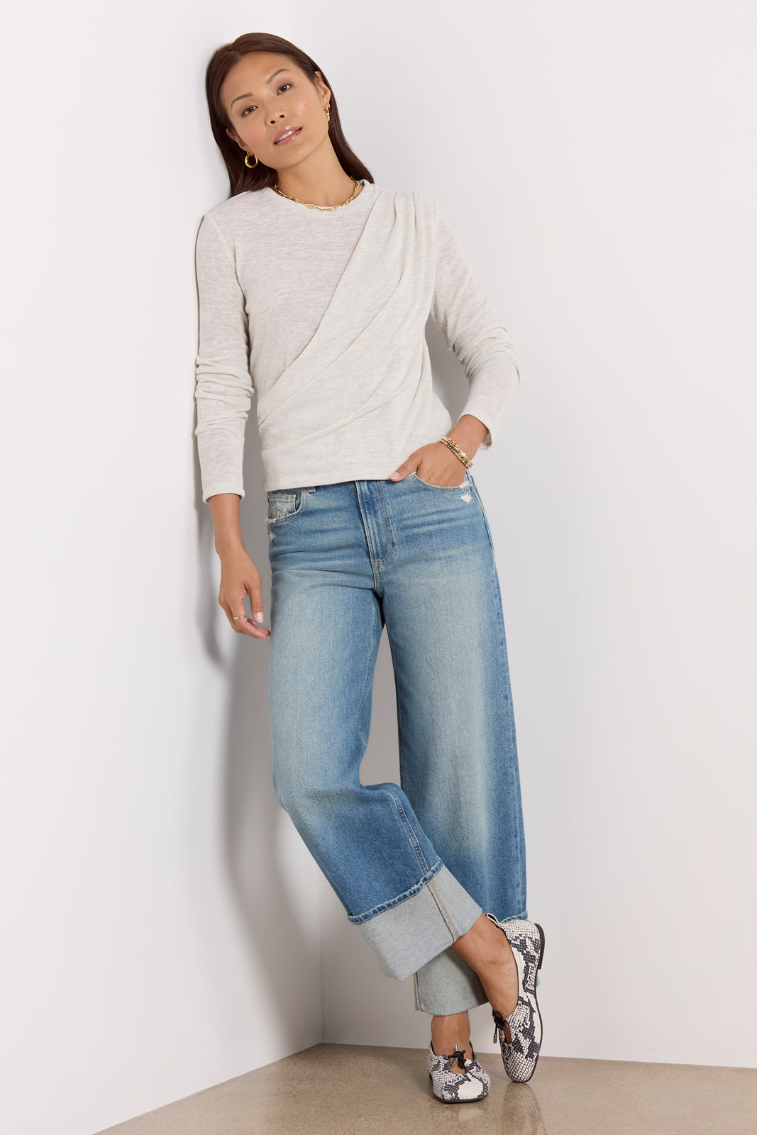 A draped. wrap-front design defines this stylish top by Sanctuary. crafted in a recycled knit with long sleeves and a crew neckline. Style it day to night with jeans or vegan leather.